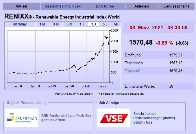 Am letzten Handelstag der vergangenen Woche (Freitag, 05.03.2021) hat der RENIXX mehrmals die 1.600 Punkte-Marke getestet. Das regenerative Kursbarometer beendet die Handelswoche letztendlich mit einem Verlust von 13,6 Prozent auf 1.579,14 Punkte und markiert damit ein neues Jahrestief. An der grundsätzlichen Richtung, d.h. einer zunehmende Dekarbonisierung der Wirtschaft, hat sich allerdings nichts geändert.