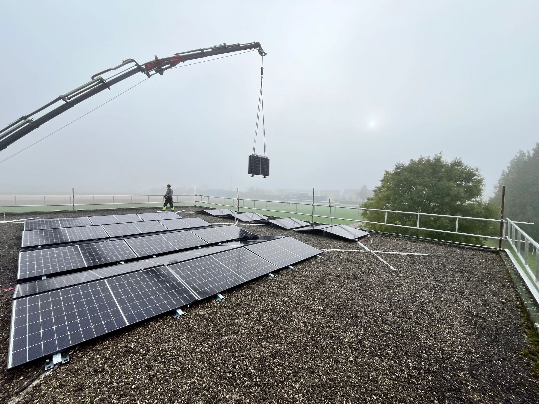 Das patentierte System wird fertig verkabelt, ballastiert und auf Mehrwegpaletten angeliefert. Ein Kran hebt die Box auf das Dach, wo drei Installateure die Anlage mit wenigen Handgriffen auseinanderfalten können - ohne Dachdurchdringung und lediglich mit einem Akkuschrauber. Neu eignet sich die SmartSolarBox auch für 600-Watt-Module, was die Montagezeit zusätzlich verkürzt. Laut Smartvolt können nun bis zu 300 Kilowatt pro Tag installiert werden - bislang waren es 200.