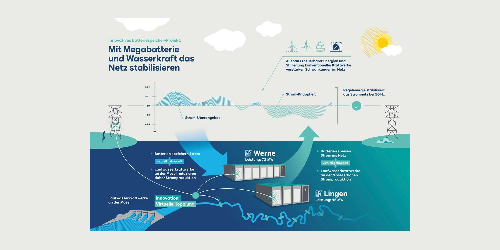 Die Batteriespeicher sollen virtuell mit den RWE Laufwasserkraftwerken entlang der Mosel gekoppelt werden. Durch das Hoch- bzw. Herunterregeln der Durchflussmenge an diesen Anlagen kann RWE zusätzliche Leistung als Regelenergie bereitstellen und die Gesamtleistung der Batterien noch einmal um rund 15 Prozent steigern, so RWE.